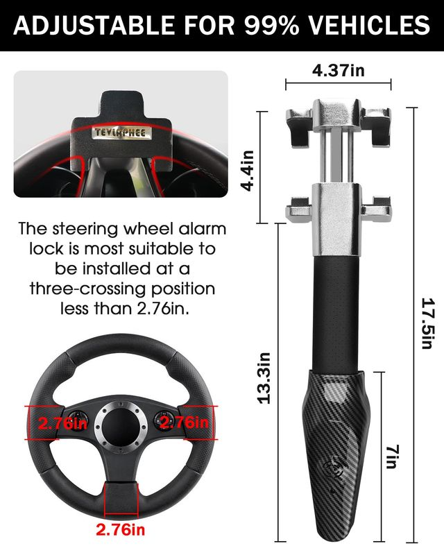 Tevlaphee Steering Wheel Lock With Alarm, 120dB, Steering Lock, Wheel Lock, Crook Locks for Cars, Car Lock Anti-Theft Device, Heavy Duty, Adjustable, Universal fit.